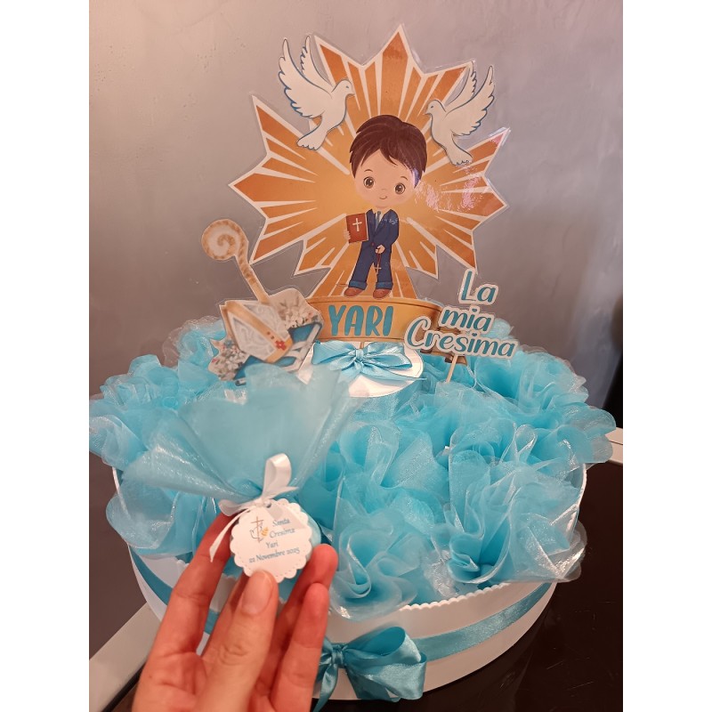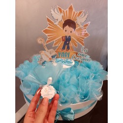 Il cesto include sacchetti porta confetti in tulle (colore personalizzabile), decorazioni a tema religioso e topper personalizzato con nome, perfetto per celebrare questo importante sacramento.