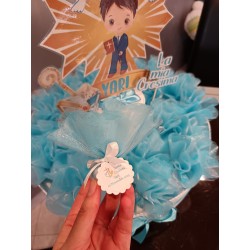 Elegante cesto per la Prima Comunione o Cresima personalizzabile, realizzato nei toni dell’azzurro ma possiamo variare i colori.