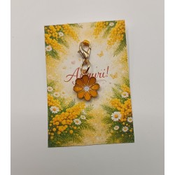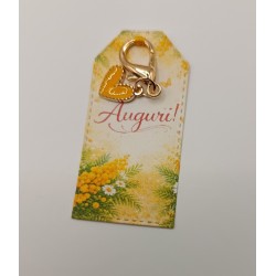 Delicato portachiavi celebrativo per la Festa della Donna – 8 Marzo, presentato su elegante cartoncino decorato con mimosa e scritta “Auguri”.