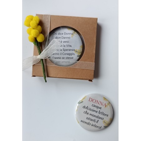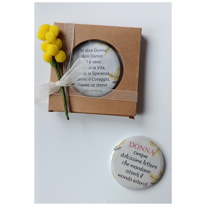 Calamita per la Festa della Donna – 8 Marzo, presentata in una scatolina decorata con rametto di mimosa.
