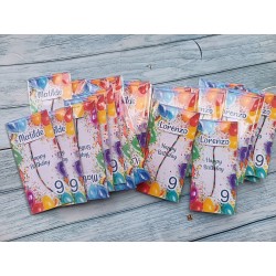 Aggiungi un tocco speciale alla festa di compleanno con questo delicato braccialetto portafortuna in cordoncino colorato, presentato in una simpatica confezione.
