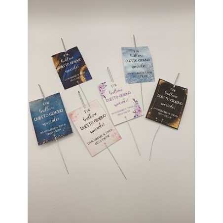 Il cartoncino può essere personalizzato con nomi, date o frasi dedicate, adattandosi a qualsiasi tema o colore dell’evento.